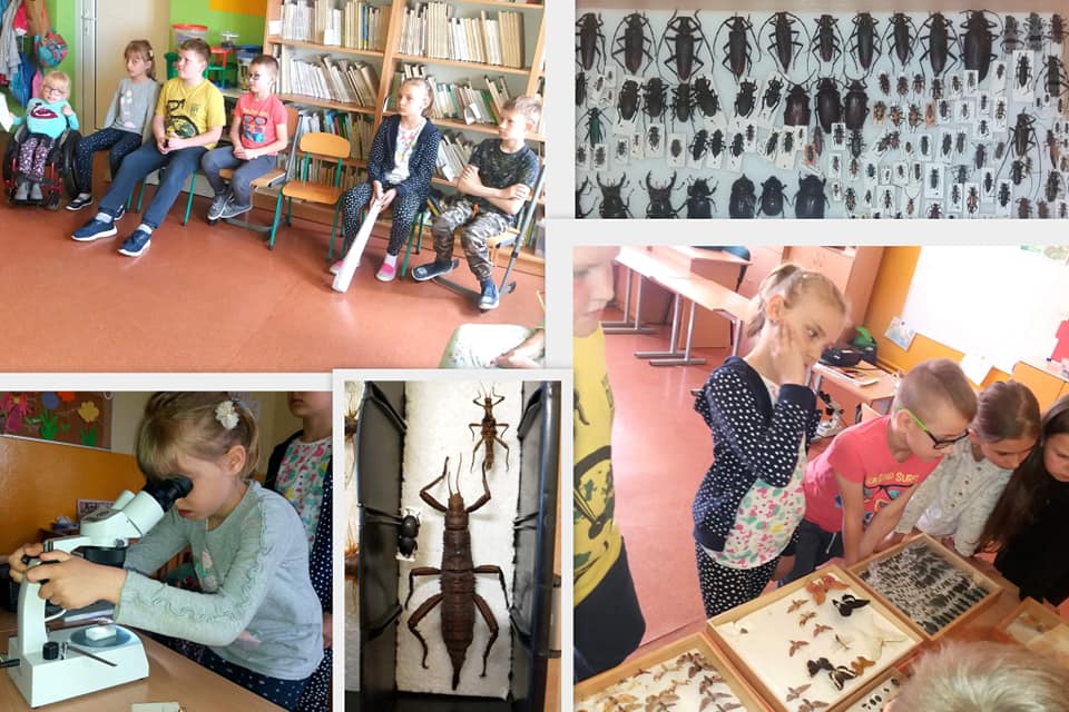 W ubiegłym tygodniu zerówka wraz z klasami 1-3 gościły pracownika Nadleśnictwa Celestynów, panią Dorotę, która przybliżyła dzieciom świat owadów. Mama Oli i Adasia podzieliła się swoją entomologiczną pasją z czasów studenckich. Uczniowie mieli okazję zobaczyć kolekcję owadów pani Doroty i jej męża Pawła, którą tworzyli wspólnie w ramach sekcji entomologicznej na wydziale leśnym SGGW. Dzieci poznały budowę chrabąszcza majowego, miejsca występowania i rolę owadów w przyrodzie. ![]()
