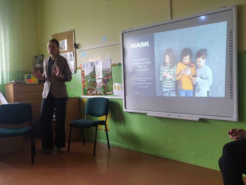 Dodatkowo wspólnie z Państwowym Instytutem Badawczym NASK zorganizowaliśmy w dniu 27 kwietnia warsztaty dla uczniów oraz dla ich rodziców. Zaproszone przez nas ekspertki, Ewa Domańska (Kierownik Zespołu Popularyzacji Bezpieczeństwa Dzieci w Internecie NASK – BIP), Julia Piechna, (Kierownik Zespołu Projektów Społecznych i Współpracy Międzynarodowej, NASK – BIP) oraz Anna Słupska (Specjalista ds. Profilaktyki w Zespole Popularyzacji Bezpieczeństwa Dzieci